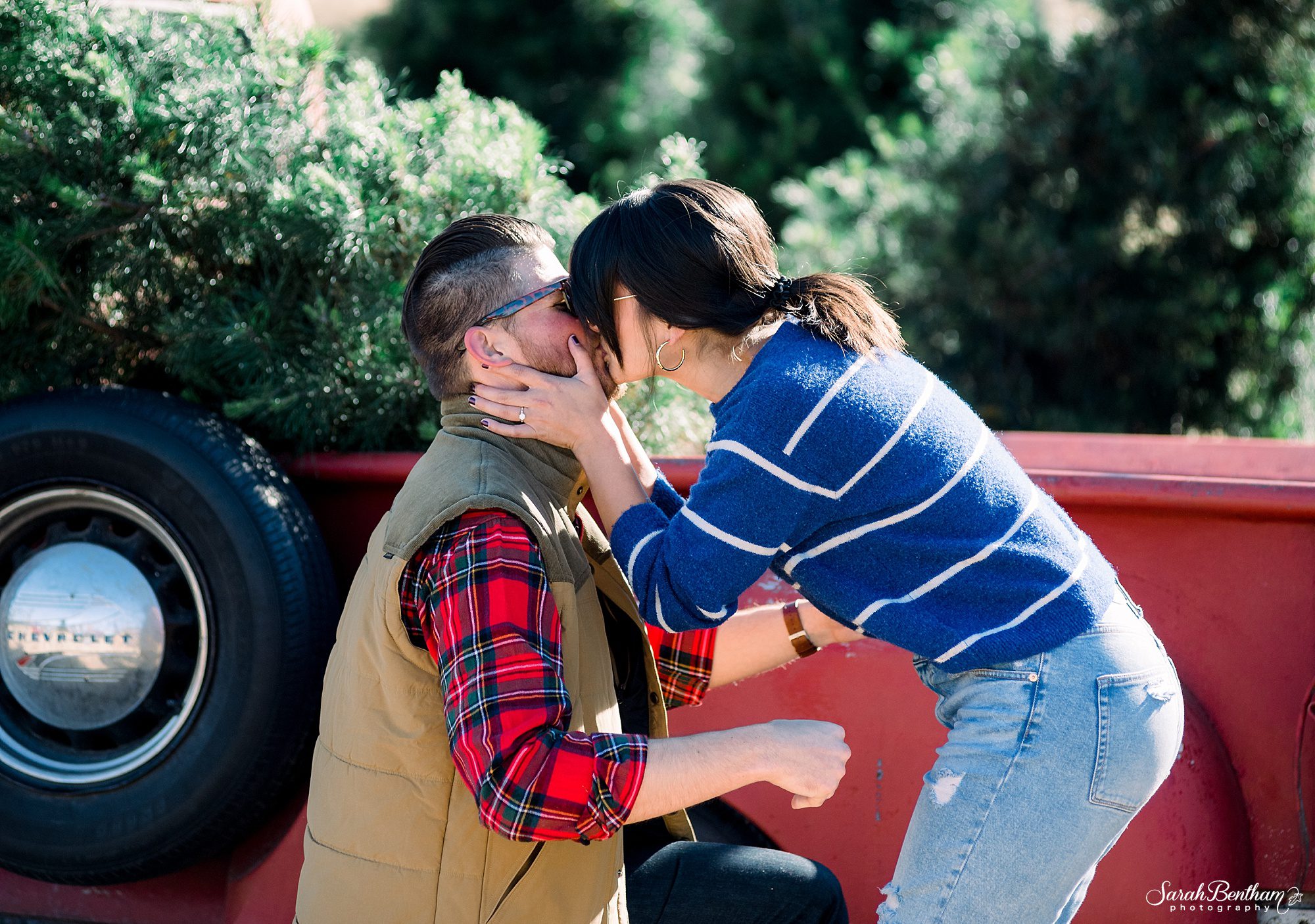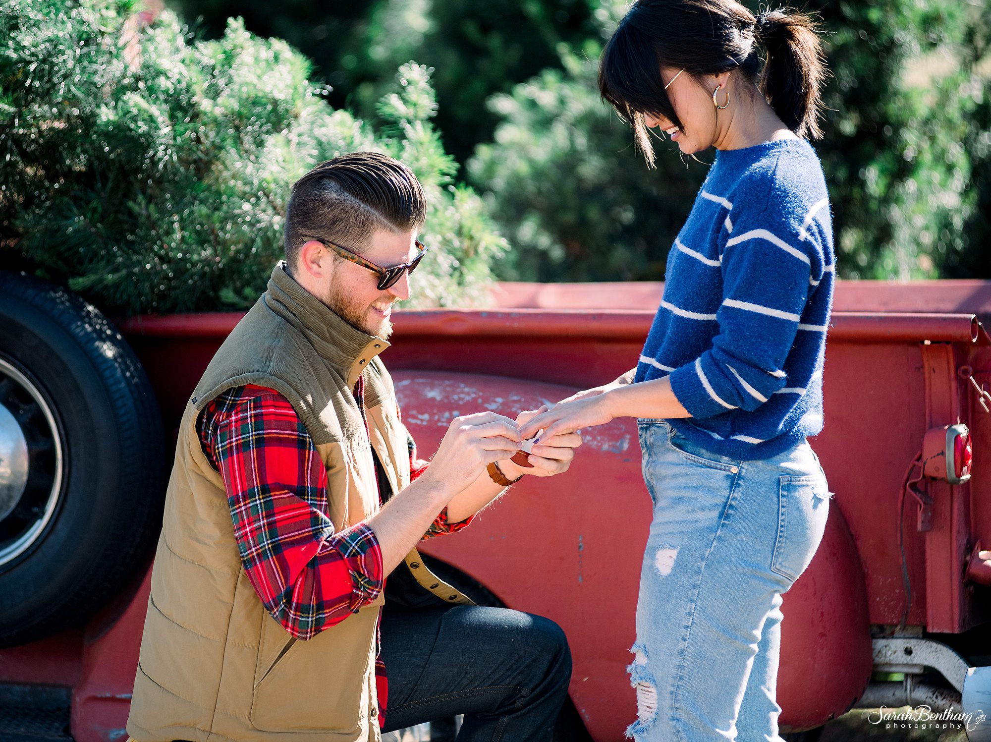I was so honored when Raymond called me to photograph his marriage proposal to Kylie at the Wonderland Christmas Tree Farm! He knew she would be completely surprised, and she definitely was! Raymond came in to the studio the week before his proposal so we could hash out a plan on where and when and how it would all take place. I was excited that morning as I arrived to the tree farm- and when I saw Kylie and Raymond, I made sure to dodge them by hiding behind cars and buildings making sure me and my big camera didn’t stand out 🙂 And when he got down on one knee to propose, it was just the sweetest moment! Of course she said yes! The old fashioned red apple truck and Christmas tree farm was the perfect backdrop for this marriage proposal, and I’m honored I got to be a part of it.
